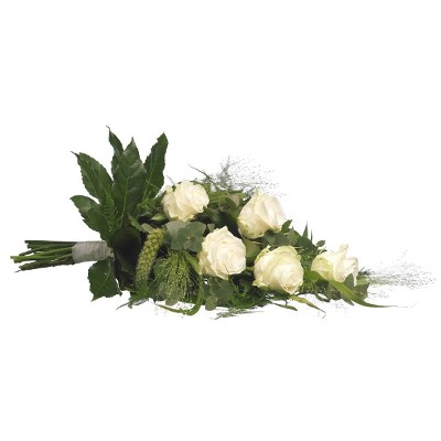 Een sierlijk rouwboeket gemaakt van witte rozen en seizoensgroen. Handgebonden en bezorgd door een lokale bloemist. De afbeelding toont de "standaard" variant. Een rouwlint kan eventueel tijdens de checkout worden bijgevoegd.